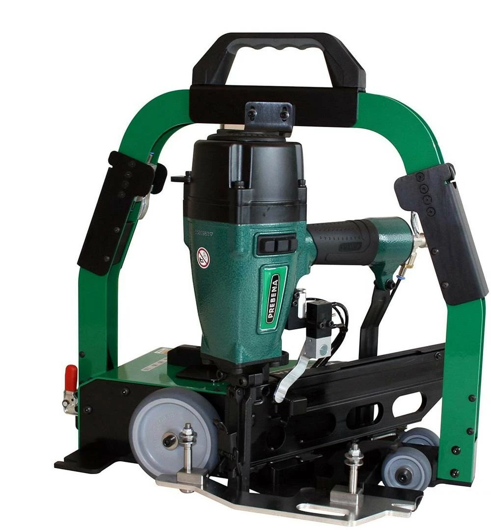 - Kein Elektroanschluss nötig, pneumatisch/mechanische Steuerung, Setzen der Klammer in genauen, regelmäßigen Abständen, exakte Einhaltung von Klammer- und Randabständen durch verstellbaren Seitenanschlag, Klammerwinkel 30° nach Eurocode 5